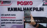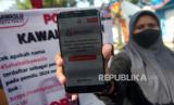 REPUBLIKA.CO.ID,TEGAL -- Petugas Bawaslu menunjukkan aplikasi Jarimu Awasi Pemilu saat apel siaga pengawasan satu tahun menuju Pemilihan Umum 2024 di kantor Bawaslu Tegal, Jawa Tengah, Selasa 14/2/2023).