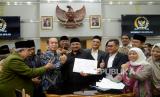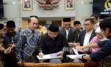 Menteri Agama Yaqut Cholil Qoumas menandatangani penetapan Biaya Penyelenggaraan Ibadah Haji (BPIH) usai rapat kerja dengan Komisi VIII DPR di kompleks Parlemen, Senayan, Jakarta, Rabu (15/2/2023). Dalam Rapat tersebut Komisi VIII DPR RI bersama Menteri Agama RI menyepakati Biaya Perjalanan Ibadah Haji (Bipih) atau biaya yang dibayar langsung oleh jemaah haji rata-rata per jemaah sebesar Rp 49.812.700.26 pada tahun 1444 H/2023 M. (FOTO : Republika/Prayogi.)