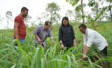 Petani serai wangi binaan Yayasan Dharma Bhakti Astra (YDBA), Adang Sabroni (kanan) didampingi Koordinator Lembaga Pengembangan Bisnis (LPB) YDBA di Lebak, Dani Kurnia (kiri) saat menunjukkan langkah memanen serai wangi kepada Ketua Pengurus YDBA, Sigit P. Kumala (kedua kiri) dan Sekretaris Pengurus YDBA, Ida R. M. Sigalingging (kanan) seusai peresmian LPB Lebak, Banten (15/02). LPB Lebak didirkan sebagai cabang YDBA di daerah dengan fokus pada pembinaan sektor UMKM pertanian yang berperan sebagai manager program, motivator dan konsultan mendampingi UMKM di wilayah tersebut secara rutin dan konsisten. (FOTO : Dok. Republika)