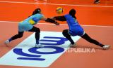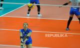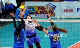Libero Bandung BJB Tandamata, Yulis (kiri) dan Opposite Nandita mengembalikan bola Jakarta Popsivo Polwan pada lanjutan Proliga 2023 di GOR UNY, Yogyakarta, Kamis (16/2/2023). Pada pertandingan ini Bandung BJB Tandamata harus takluk di tangan Jakarta Popsivo Polwan 2-3 (21-25, 25-19, 28-30, 25-15, 10-15). (FOTO : Republika/Wihdan Hidayat)
