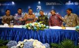 Direktur Utama PT Bank Tabungan Negara (Persero) Tbk. Haru Koesmahargyo bersama Jajaran Direksi Bank BTN Setiyo Wibowo, Nofry Rony Poetra, Nixon L.P Napitupulu, Andi Nirwoto, dan Hirwandi Gafar tersenyum menunjuk materi laporan keuangan perseroan dalam acara Konferensi Pers Paparan Kinerja per 31 Desember 2022 di Menara BTN, Jakarta, Kamis (16/2). (FOTO : Dok. Republika)