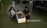 Warga melintasi jalan yang tergenang banjir sambil membawa anaknya di Kecamatan Biringkanaya, Makassar, Sulawesi Selatan, Jumat (17/2/2023). Hujan deras yang mengguyur Kota Makassar sejak Senin (13/2) malam tersebut merendam permukiman warga hingga ketinggian air mencapai 1 meter di beberapa lokasi sehingga sejumlah kepala keluarga terpaksa mengungsi sementara ke tempat yang lebih aman. (FOTO : Antara/Abriawan Abhe )