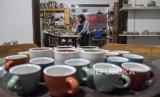 Pekerja menata gelas keramik yang dijual di Elina Keramik, Jalan Taman Pramuka, Bandung Wetan, Kota Bandung, Provinsi Jawa Barat, Sabtu (18/2/2023). Berbagai jenis kerajinan keramik seperti mangkuk, gelas, aksesoris, cinderamata dan dekorasi rumah yang dijual dengan harga Rp10 ribu hingga Rp3,5 juta tersebut telah menembus pasar ekspor di Singapura, Belanda dan Uni Emirat Arab. (FOTO : ABDAN SYAKURA/REPUBLIKA)