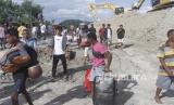 Sejumlah warga melintas di samping area materail longsor yang menutupi jalan trans Pulau Timor di Desa Oelmina, Kecamatan Takari, Kabupaten Kupang, NTT, Ahad (19/2/2023). Longsor yang terjadi pada Jumat (17/2/2023) malam tersebut mengakibatkan terputusnya akses transportasi yang menghubungkan wilayah pulau Timor mulai dari Kota Kupang, Kabupaten Kupang, Kabupaten Timor Tengah Selatan, Kabupaten Timor Tengah Utara, Kabupaten Belu, Kabupaten Malaka, serta negara Timor Leste. (FOTO : ANTARA FOTO/Kornelis Kaha)