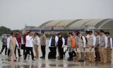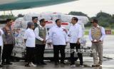 Presiden Joko Widodo (kedua kiri) menyalami relawan yang akan diberangkatkan ke Turki dan Suriah di Lanud Halim Perdana Kusuma, Jakarta, Selasa (21/2/2023). Pemerintah Indonesia kembali mengirimkan bantuan untuk korban gempa Turki dan Suriah berupa 140 ton bahan makanan dan logistik yang dibutuhkan korban gempa. (FOTO : Republika/Putra M. Akbar)