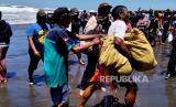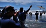 Warga mengambil ubo rampe saat Labuhan Alit di Pantai Parangkusumo, Parangtritis, Bantul, Yogyakarta, Selasa (21/2/2023). Tradisi Keraton Yogyakarta ini diadakan setiap 30 Rajab dalam rangka Tingalan Jumenengan Dalem atau peringatan kenaikan tahta Raja Sri Sultan Hamengku Buwono X. Labuhan Alit yang diadakan tahunan ini menjadi salah satu daya tarik wisatawan terutama untuk wisata budaya. (FOTO : Republika/Wihdan Hidayat)