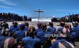 Abdi dalem Keraton Yogyakarta berdoa saat prosesi Labuhan Alit di Pantai Parangkusumo, Parangtritis, Bantul, Yogyakarta, Selasa (21/2/2023). Tradisi Keraton Yogyakarta ini diadakan setiap 30 Rajab dalam rangka Tingalan Jumenengan Dalem atau peringatan kenaikan tahta Raja Sri Sultan Hamengku Buwono X. Labuhan Alit yang diadakan tahunan ini menjadi salah satu daya tarik wisatawan terutama untuk wisata budaya. (FOTO : Republika/Wihdan Hidayat)