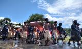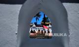 Warga dengan pakaian tradisional menonton prosesi Labuhan Alit di Pantai Parangkusumo, Parangtritis, Bantul, Yogyakarta, Selasa (21/2/2023). Tradisi Keraton Yogyakarta ini diadakan setiap 30 Rajab dalam rangka Tingalan Jumenengan Dalem atau peringatan kenaikan tahta Raja Sri Sultan Hamengku Buwono X. Labuhan Alit yang diadakan tahunan ini menjadi salah satu daya tarik wisatawan terutama untuk wisata budaya. (FOTO : Republika/Wihdan Hidayat)