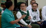 Ketua Umum PKB Muhaimin Iskandar (tengah) berbincang dengan Ketua Lembaga Pemenangan Pemilu (LPP) PKB Jazilul Fawaid (kiri) dan Sekjen PKB Hasanudin Wahid (kanan) dalam acara uji kelayakan dan kepatutan bakal calon anggota legislatif DPR RI 2024 di Kantor DPP PKB, Jakarta, Selasa (21/2/2023). DPP PKB mengelar uji kelayakan dan kepatutan sebagai bentuk komitmen besar untuk menjaring caleg-caleg yang memiliki integritas dan kapabilitas. Uji Kelayakan dan Kepatutan ini dilakukan dengan melibatkan tokoh-tokoh sebagai tim penguji mulai dari akademisi, praktisi, ulama, jurnalis, dan aktivis (FOTO : Republika/Prayogi.)
