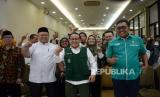 Ketua Umum PKB Muhaimin Iskandar (tengah) bersama Ketua Lembaga Pemenangan Pemilu (LPP) PKB Jazilul Fawaid (kanan) berfoto dalam acara uji kelayakan dan kepatutan bakal calon anggota legislatif DPR RI 2024 di Kantor DPP PKB, Jakarta, Selasa (21/2/2023). DPP PKB mengelar uji kelayakan dan kepatutan sebagai bentuk komitmen besar untuk menjaring caleg-caleg yang memiliki integritas dan kapabilitas. Uji Kelayakan dan Kepatutan ini dilakukan dengan melibatkan tokoh-tokoh sebagai tim penguji mulai dari akademisi, praktisi, ulama, jurnalis, dan aktivis (FOTO : Republika/Prayogi.)