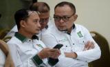 Wakil Ketua Umum PKB Hanif Dhakiri berbincang dengan Sekjen PKB Hasanudin Wahid berfoto dalam acara uji kelayakan dan kepatutan bakal calon anggota legislatif DPR RI 2024 di Kantor DPP PKB, Jakarta, Selasa (21/2/2023). DPP PKB mengelar uji kelayakan dan kepatutan sebagai bentuk komitmen besar untuk menjaring caleg-caleg yang memiliki integritas dan kapabilitas. Uji Kelayakan dan Kepatutan ini dilakukan dengan melibatkan tokoh-tokoh sebagai tim penguji mulai dari akademisi, praktisi, ulama, jurnalis, dan aktivis. (FOTO : Republika/Prayogi.)