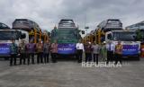 Menteri Perindustrian Agus Gumiwang Kartasasmita (keenam kanan) berfoto bersama saat acara Ekspor Perdana Kendaraan Elektrifikasi Produk Lokal Toyota Indonesia dari Indonesia untuk Dunia, di Karawang Plant 3 TMMIN, Karawang, Jawa Barat, Selasa (21/2/2023). TMMIN berharap ekspor Kijang Innova Zenix akan terus meningkat. (FOTO : Dok Republika)