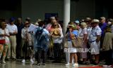 Wisatawan mancanegara berkumpul saat turun dari kapal pesiar MV Silver Muse yang bersandar di Pelabuhan Sukarno Hatta, Makassar, Sulawesi Selatan, Rabu (22/2/2023). Kapal pesiar yang memiliki panjang 212,8 meter dan membawa 547 wisatawan asal negara Eropa seperti Belanda dan Inggris tersebut akan berkunjung ke sejumlah destinasi wisata di kota Makassar sebelum melanjutkan pelayaran ke Pulau Komodo Nusa Tenggara Timur. (FOTO : Antara/Abriawan Abhe )