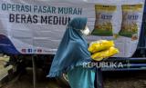 Warga membawa beras kualitas medium saat operasi pasar beras medium di Lapangan Gasmin, Jalan Purwakarta, Antapani, Kota Bandung, Provinsi Jawa Barat, Rabu (22/2/2023). Pemerintah Kota Bandung bersama Bulog Kota Bandung dan Bank Indonesia menggelar operasi pasar yang menyediakan beras medium sebanyak 20 ton per kecamatan dengan harga Rp8.500 per kilogram atau Rp42.500 per kemasan lima kilogram. Operasi pasar tersebut diharapkan dapat membantu masyarakat menjelang bulan Ramadhan serta upaya menekan kenaikan harga beras di Kota Bandung. (FOTO : ABDAN SYAKURA/REPUBLIKA)