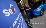 CEO SEVA Handoko Liem di depan unit mobil di Auto 2000 Menara Astra, Jl Sudirman, Jakarta, Rabu (22/2/2023) (FOTO : Republika/Yogi Ardhi)