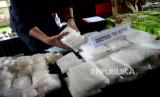 Petugas memasukan barang bukti sabu usai rilis pengungkapan kasus narkoba di Bareskrim Polri, Jakarta, Rabu (22/2/2023). Direktorat Tindak Pidana Narkoba Bareskrim Polri menggagalkan upaya peredaran narkotika jenis sabu jaringan Malaysia dengan mengungkap dua kasus pada periode Februari 2023. Adapun total barang bukti sitaan 220 kilogram sabu dan 705 butir ekstasi dengan tujuh tersangka. (FOTO : Republika/Prayogi.)