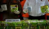 Petugas menunjukan barang bukti saat rilis pengungkapan kasus narkoba di Bareskrim Polri, Jakarta, Rabu (22/2/2023). Direktorat Tindak Pidana Narkoba Bareskrim Polri menggagalkan upaya peredaran narkotika jenis sabu jaringan Malaysia dengan mengungkap dua kasus pada periode Februari 2023. Adapun total barang bukti sitaan 220 kilogram sabu dan 705 butir ekstasi dengan tujuh tersangka. (FOTO : Republika/Prayogi.)