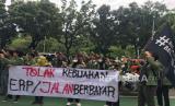 REPUBLIKA.CO.ID,JAKARTA  -- Para mahasiswa dari Universitas Pembangunan Nasional Veteran Jakarta (UPNVJ) melakukan unjuk rasa di depan Gedung Balai Kota, DKI Jakarta pada Kamis (23/2/2023).