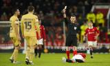 Wasit Clement Turpin menunjukkan kartu kuning kepada pemain Barcelona Sergio Busquets (kiri) setelah ia melakukan pelanggaran terhadap pemain Manchester United Alejandro Garnacho, pada pertandingan sepak bola leg kedua playoff Liga Europa antara Manchester United dan Barcelona di stadion Old Trafford di Manchester, Inggris, Jumat (24/2/2023) dini hari WIB (FOTO : AP Photo/Dave Thompson)