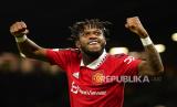 Pemain Manchester United Fred berselebrasi setelah rekan setimnya Antony mencetak gol kedua timnya selama pertandingan sepak bola leg kedua playoff Liga Europa antara Manchester United dan Barcelona di stadion Old Trafford di Manchester, Inggris, Jumat (24/2/2023) dini hari WIB (FOTO : AP Photo/Dave Thompson)