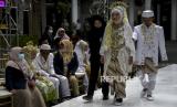 Sejumlah pasangan pengantin disabilitas dan lanjut usia (lansia) menunggu giliran untuk menjalani akad saat kegiatan Nikah Massal di Mal Cihampelas Walk, Jalan Cihampelas, Coblong, Kota Bandung, Provinsi Jawa Barat, Jumat (24/2/2023). Nikah massal yang merupakan salah satu rangkaian dari acara Indonesia Wedding Festival 2.0 tersebut diikuti oleh tujuh pasangan disabilitas dan lansia. (FOTO : ABDAN SYAKURA/REPUBLIKA)