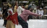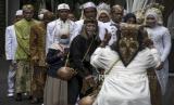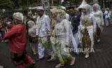 Sejumlah pasangan pengantin disabilitas dan lanjut usia (lansia) bersama pendamping mengikuti prosesi adat saat kegiatan Nikah Massal di Mal Cihampelas Walk, Jalan Cihampelas, Coblong, Kota Bandung, Provinsi Jawa Barat, Jumat (24/2/2023). Nikah massal yang merupakan salah satu rangkaian dari acara Indonesia Wedding Festival 2.0 tersebut diikuti oleh tujuh pasangan disabilitas dan lansia. (FOTO : ABDAN SYAKURA/REPUBLIKA)