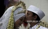 Pengantin pria mencium kening pengantin wanita usai menjalani prosesi akad nikah di Mal Cihampelas Walk, Jalan Cihampelas, Coblong, Kota Bandung, Provinsi Jawa Barat, Jumat (24/2/2023). Nikah massal yang merupakan salah satu rangkaian dari acara Indonesia Wedding Festival 2.0 tersebut diikuti oleh tujuh pasangan disabilitas dan lansia. (FOTO : ABDAN SYAKURA/REPUBLIKA)