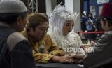 Pasangan pengantin lanjut usia (lansia) bersiap untuk menjalani prosesi akad nikah saat kegiatan Nikah Massal di Mal Cihampelas Walk, Jalan Cihampelas, Coblong, Kota Bandung, Provinsi Jawa Barat, Jumat (24/2/2023). Nikah massal yang merupakan salah satu rangkaian dari acara Indonesia Wedding Festival 2.0 tersebut diikuti oleh tujuh pasangan disabilitas dan lansia. (FOTO : ABDAN SYAKURA/REPUBLIKA)