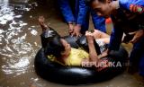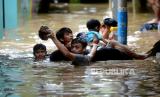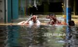 Anak-anak berenang ketika banjir merendam di kawasan Kebon Pala, Kampung Melayu, Jatinegara, Jakarta Timur, Senin (27/2/2023). (FOTO : Republika/Prayogi.)