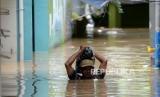 Seorang warga melintasi banjir yang merendam kawasan Kebon Pala, Kampung Melayu, Jatinegara, Jakarta Timur, Senin (27/2/2023). (FOTO : Republika/Prayogi.)