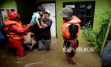 Petugas membantu warga melintasi melintasi banjir yang merendam kawasan Kebon Pala, Kampung Melayu, Jatinegara, Jakarta Timur, Senin (27/2/2023). (FOTO : Republika/Prayogi.)