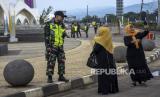 Anggota TNI mengarahkan warga untuk keluar dari kawasan Masjid Raya Al Jabbar, Gedebage, Kota Bandung, Provinsi Jawa Barat, Senin (27/2/2023). Pemerintah Daerah Provinsi Jawa Barat menutup sementara Masjid Raya Al Jabbar hingga 13 Maret mendatang dalam rangka penataan dan pemeliharaan jelang bulan suci Ramadhan. (FOTO : ABDAN SYAKURA/REPUBLIKA)