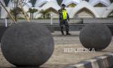 Anggota TNI berjaga di depan pintu masuk Masjid Raya Al Jabbar, Gedebage, Kota Bandung, Provinsi Jawa Barat, Senin (27/2/2023). Pemerintah Daerah Provinsi Jawa Barat menutup sementara Masjid Raya Al Jabbar hingga 13 Maret mendatang dalam rangka penataan dan pemeliharaan jelang bulan suci Ramadhan. (FOTO : ABDAN SYAKURA/REPUBLIKA)
