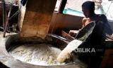 Pengerajin menuangkan gilingan kedelai ke tungku masak di pabrik tahu Sentosa Adi, Gedongkiwo, Yogyakarta, Senin (27/2/2023). (FOTO : Republika/Wihdan Hidayat)