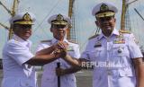 REPUBLIKA.CO.ID, SURABAYA -- Panglima Komando Armada Republik Indonesia (Pangkoarmada RI) Laksamana Madya TNI Heru Kusmanto melakukan salam komando dengan Pangkoarmada II Laksamana Muda TNI Maman Firmansyah dan Laksamana Muda TNI T.S.N.B. Hutabarat usai upacara Serah Terima Jabatan Panglima Komando Armada II di Koarmada II, Surabaya, Jawa Timur, Senin (27/2/2023).