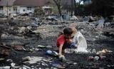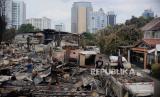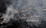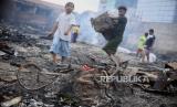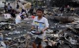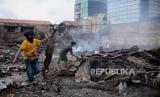 Seorang anak mencari barang berharga sisa kebakaran di kawasan Tanah Abang, Jakarta, Senin (27/2/2023). Sebanyak 87 rumah tinggal dan 250 bangunan semi permanen hangus terbakar pada Ahad (26/3/2023), yang hingga kini penyebabnya masih dalam penyelidikan dan kerugian ditaksir mencapai Rp 1 Miliar. (FOTO : Republika/Putra M. Akbar)