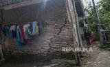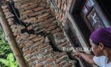 REPUBLIKA.CO.ID,LEBAK -- Warga menunjukkan retakan dinding rumah yang rusak akibat pergerakan tanah di Cigoong Utara, Lebak, Banten, Selasa (28/2/2023).