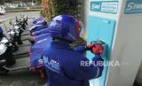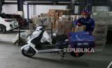 Petugas membawa paket mengunakan armada TIKI Electric Vehicle Squad (EVS) SPBLU SWAP di kantor cabang Tiki Pemuda di Jakarta, Rabu (1/3/2023). PT Citra Van Titipan Kilat (Tiki) bekerjasama dengan perusahaan Infrastruktur Stasiun Penukaran Baterai Kendaraan Listrik Umum (SPBKLU) SWAP dan produsen kendaraan listrik SMOOT untuk meluncurkan armada TIKI Electric Vehicle Squad (EVS) serta instalasi 17 SPBLU SWAP di jaringan gerai Tiki.Peluncuran ini menjadi langkah awal Tiki mentransisi operasionalnya melalui pemanfaatan energi ramah lingkungan. (FOTO : Tahta Aidilla/Republika)