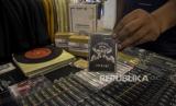 Penjual menunjukkan kaset rilisan Lokananta Records pada gelaran Pasar Musik Bandung di The Hallway Space, Sumur Bandung, Kota Bandung, Jawa Barat, Jumat (3/3/2023). Pasar Musik Bandung tersebut memamerkan dan menjual sejumlah koleksi lama kaset, majalah musik, piringan hitam dan pakaian dari 23 kolektor serta pelaku usaha rilisan fisik di berbagai daerah di Indonesia. Acara yang bertujuan sebagai ajang silaturahmi pencinta rilisan fisik tersebut digelar hingga 5 Maret mendatang. (FOTO : ABDAN SYAKURA/REPUBLIKA)