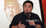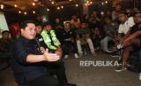 REPUBLIKA.CO.ID,SURABAYA -- Ketua Umum PSSI Erick Thohir berbincang dengan sejumlah suporter Persebaya Surabaya di Warung Kopi (Warkop) Pitulikur, Surabaya, Jawa Timur, Jumat (3/3/2023).