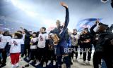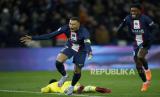 Pemain Paris Saint Germain Kylian Mbappe melakukan selebrasi saat merayakan kemenangan 4-2 saat pertandingan sepak bola Liga 1 Prancis antara PSG dan FC Nantes, di Paris, Prancis, (4/3/2023). (FOTO : EPA-EFE/YOAN VALAT)