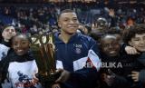 REPUBLIKA.CO.ID, -- Pemain Paris Saint Germain, Kylian Mbappe, merayakan dengan trofi Pencetak Gol Terbanyak setelah mencetak golnya yang ke-201 bersama PSG dalam pertandingan sepak bola Ligue 1 Prancis antara PSG dan FC Nantes, di Paris, Prancis, (4/3/2023). Mbappe menjadi pencetak gol terbanyak sepanjang masa untuk PSG dengan 201 gol.