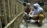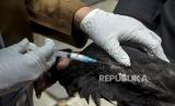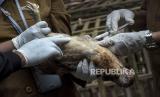 Petugas Dinas Ketahanan Pangan dan Pertanian (DKPP) Kota Bandung bersiap untuk menyuntikkan vaksin kombinasi ND+AI Inaktif ke seekor ayam di Kantor DKPP Kota Bandung, Jalan Arjuna, Cicendo, Kota Bandung, Jawa Barat, Senin (6/3/2023). DKPP Kota Bandung memberikan vitamin dan melakukan vaksinasi terhadap unggas milik kelompok peternak sebagai upaya pencegahan dan kewaspadaan munculnya kasus flu burung di Kota Bandung. (FOTO : ABDAN SYAKURA/REPUBLIKA)