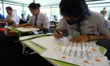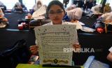 REPUBLIKA.CO.ID, SOLO -- Siswa menunjukkan karyanya saat mengikutil lomba menulis aksara jawa di Ndalem Prangwedanan, Keraton Mangkunegaran, Solo, Jawa Tengah, Senin (6/3/2023).