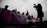 Sejumlah massa aksi melakukan unjuk rasa di kawasan Patung Kuda Arjuna Wiwaha, Jakarta, Rabu (8/3/2023). Unjuk rasa yang tergabung dalam berbagai aliansi buruh dan aktivis perempuan tersebut dalam rangka memperingati Hari Perempuan Sedunia 2023. Dalam aksinya mereka menuntut pemerintah mengabulkan hak-hak perempuan, salah satunya hak cuti selama haid atau menstruasi. (FOTO : Republika/Putra M. Akbar)