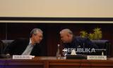 Dirjen Bea dan Cukai Askolani (kiri) dan Inspektur Jenderal Kementerian Keuangan Awan Nurnawan Nuh berbjncang disela konferensi pers di Jakarta, Rabu (8/3/2023).  (FOTO : Republika/Putra M. Akbar)