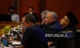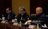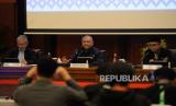 Inspektur Jenderal Kementerian Keuangan Awan Nurnawan Nuh (tengah), Dirjen Pajak Suryo Utomo (kanan) dan Sekjen Kementerian Keuangan Heru Pambudi (kiri) menyampaikan konferensi pers di Jakarta, Rabu (8/3/2023).  (FOTO : Republika/Putra M. Akbar)