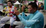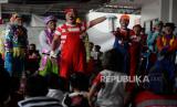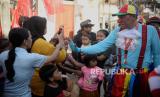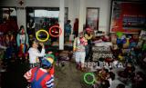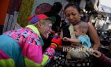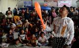 REPUBLIKA.CO.ID, PLUMPANG -- Anggota Aku Badut Indonesia menghiburi warga korban kebakaran di salah satu posko pengungsian di kawasan Rawa Badak, Jakarta, Rabu (8/3/2023).