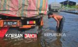 REPUBLIKA.CO.ID,KUDUS -- Sopir membasuh muka saat mencuci mobil truk di jalan nasional jalur Pantura (Pantai Utara) yang tergenang banjir, Desa Jati Wetan, Kudus, Jawa Tengah, Kamis (9/3/2023).