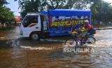 Kendaraan menerobos jalan yang tergenang banjir di jalan nasional jalur Pantura (Pantai Utara) Desa Jati Wetan, Kudus, Jawa Tengah, Kamis (9/3/2023). Banjir akibat curah hujan tinggi dan menyebabkan kemacetan dari arah Kudus menuju Semarang dan sebaliknya sejak sepekan yang lalu itu mulai berangsur surut. (FOTO : Antara/Yusuf Nugroho )